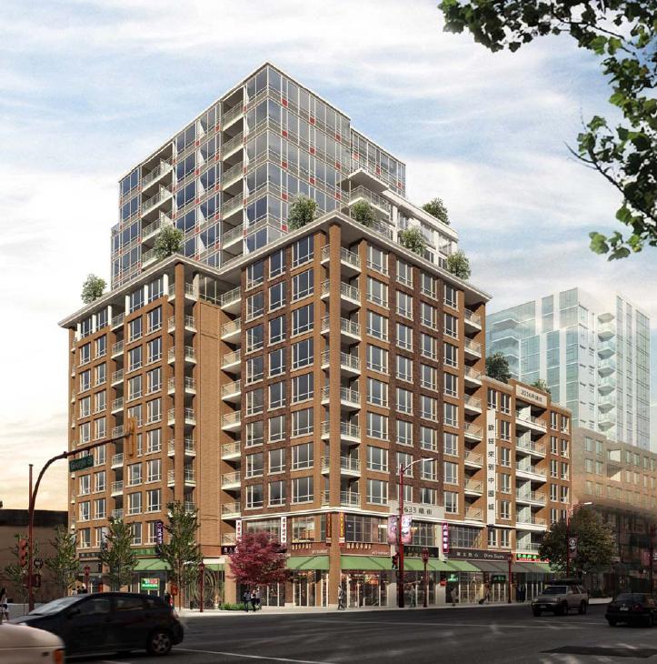 BlueSky Properties‘ project at 633 Main Street has been revised slightly. The proposal is now calling for more residential units (now 188) while reducing the project’s overall density from 9.29 to 8.86 FSR. The site is zoned HA-1A and was sold to BlueSky by Colliers in 2011.