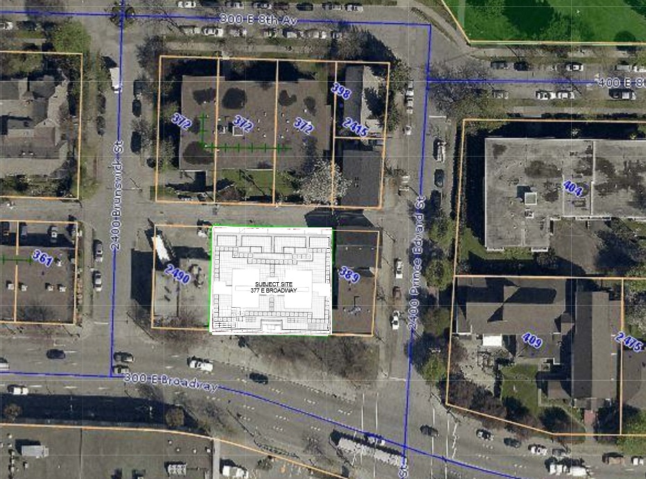 A development application has been submitted for a site at 379 East Broadway in East Vancouver, across from Kingsgate Mall. The plan is to develop the 8,677 SF, C-3A zoned site with a 5-storey mixed use building. The proposal includes the following