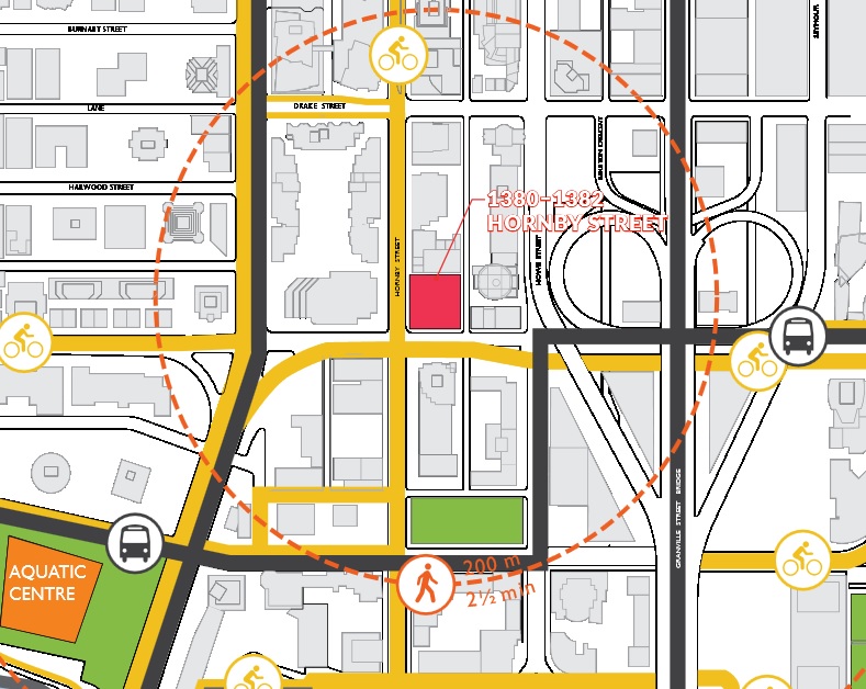 The plan for the 15,000 SF site at 1380-1382 Hornby Street is for a 39-storey residential building and includes:
