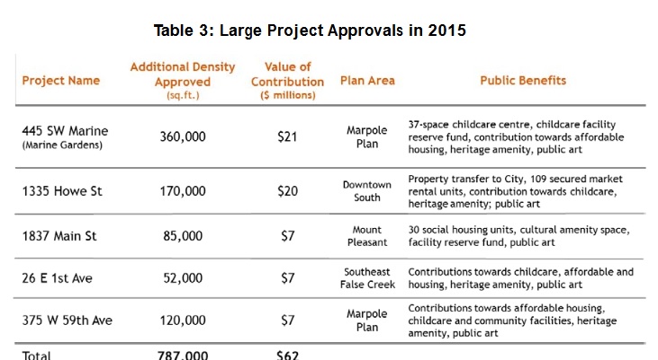 Coincidentally, Council will also receive the Annual Report on Community Amenity Contributions and Density Bonusing for 2015 (the report can be viewed here: http://council.vancouver.ca/20160531/documents/a1.pdf) . Here are a few highlights: