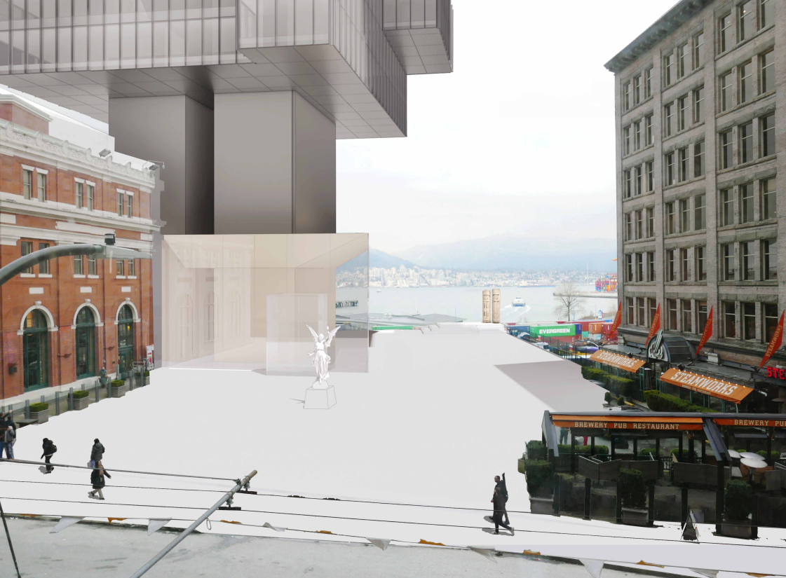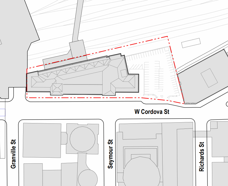 Cadillac Fairview has submitted a new development application to the City of Vancouver for 601 West Cordova Street, currently the surface parking lot between the Waterfront Station building and The Landing.