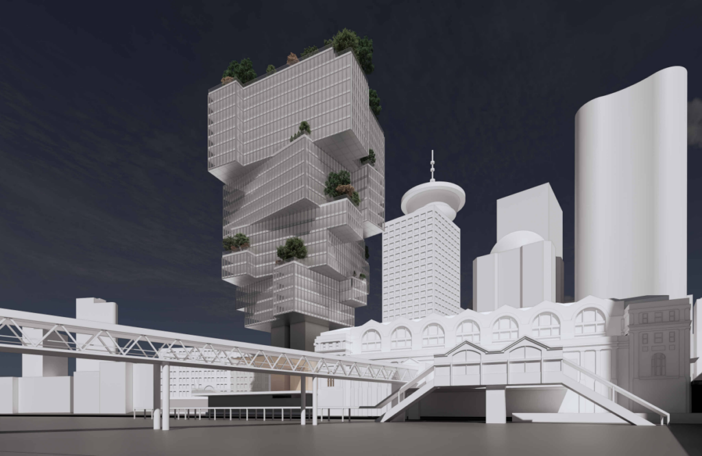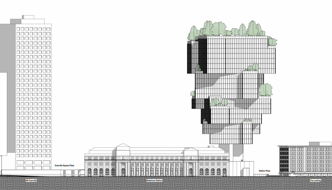 The current proposal calls for a 22-storey office building, stacked to look like a silhouette of a tree and cantilevered over Waterfront Station. Details include: