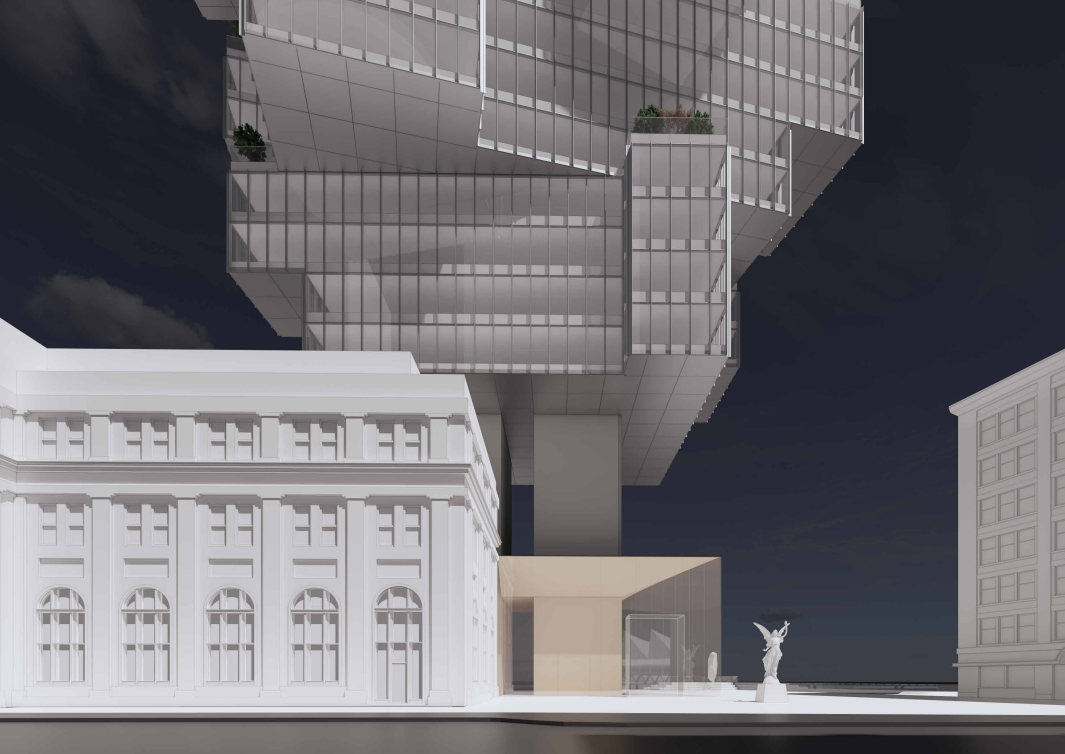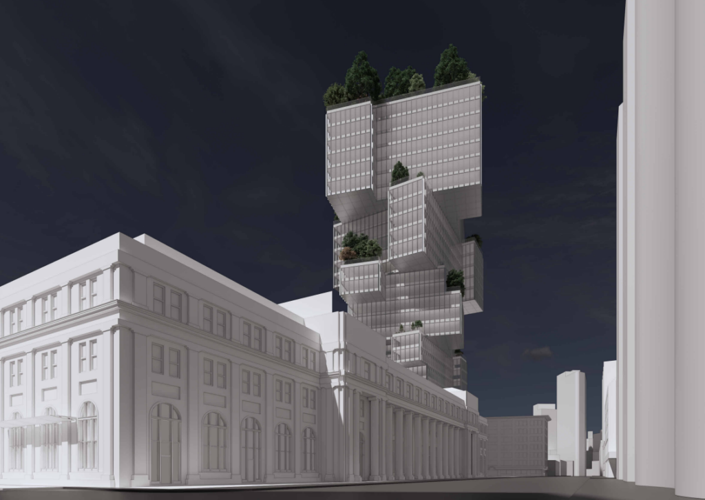 The redesigned project includes a 26-storey, 416,000 SF office tower, shaped like a tree, cantilevered over the existing station building.