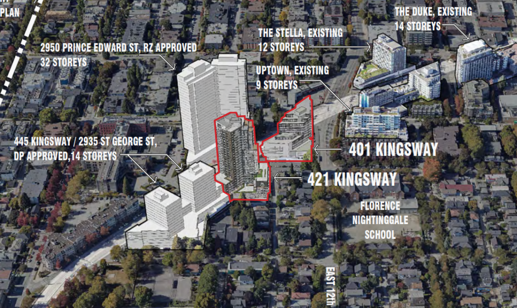 Rezoning applications have been submitted for the Regency Toyota site and adjacent property at 401 and 421 Kingsway in the Mount Pleasant area of East Vancouver.