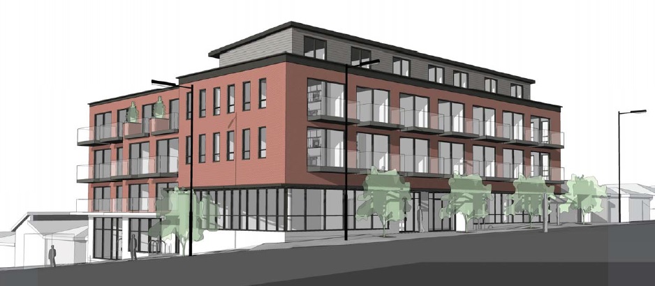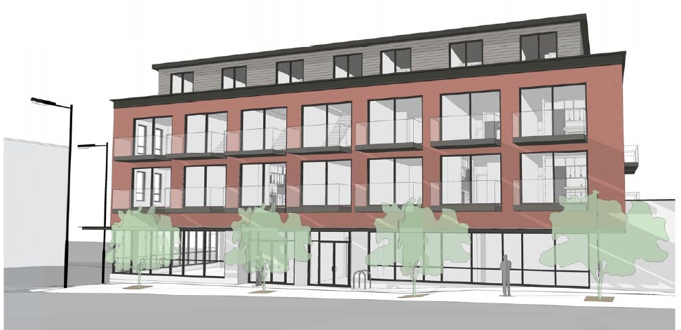 A development application has been submitted to redevelop a single-storey retail building on four lots on Victoria Drive near East 54th Avenue. The plan for the C-2 zoned site at 7151 Victoria drive is for a 4-storey woodframe mixed use building that includes: