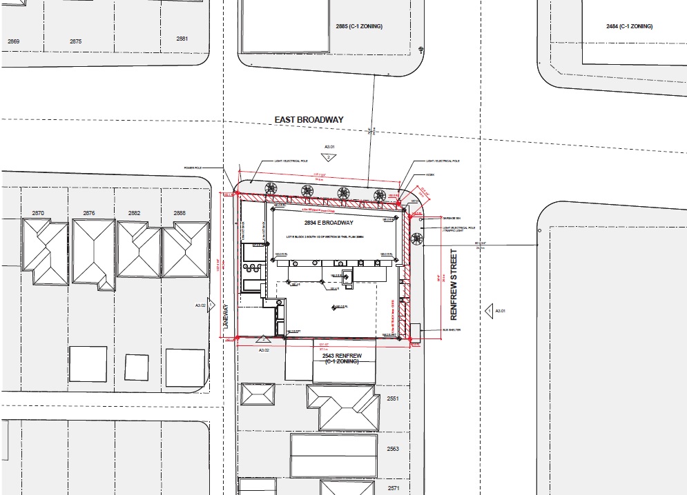 Decorus Developments has filed a rezoning application for a C-1 zoned strip retail property at the corner of Broadway and Renfrew in East Vancouver. The plan for the site at 2894 East Broadway calls for rezoning from the existing C-1 to allow a new rental apartment buildings that includes: