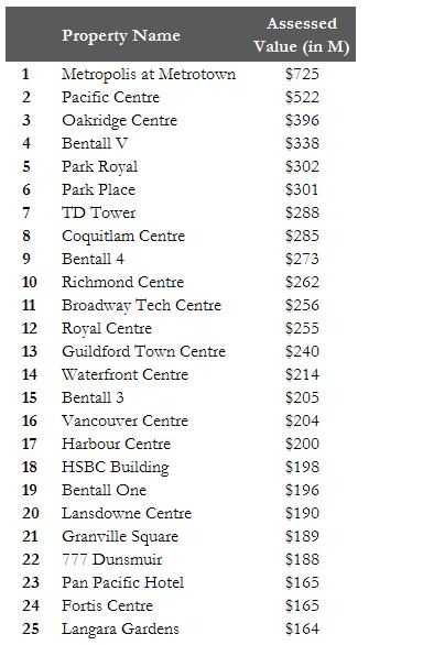 The top-10 list has been compiled based upon total assessed values, and excludes strata titled, co-op or non-freehold properties.